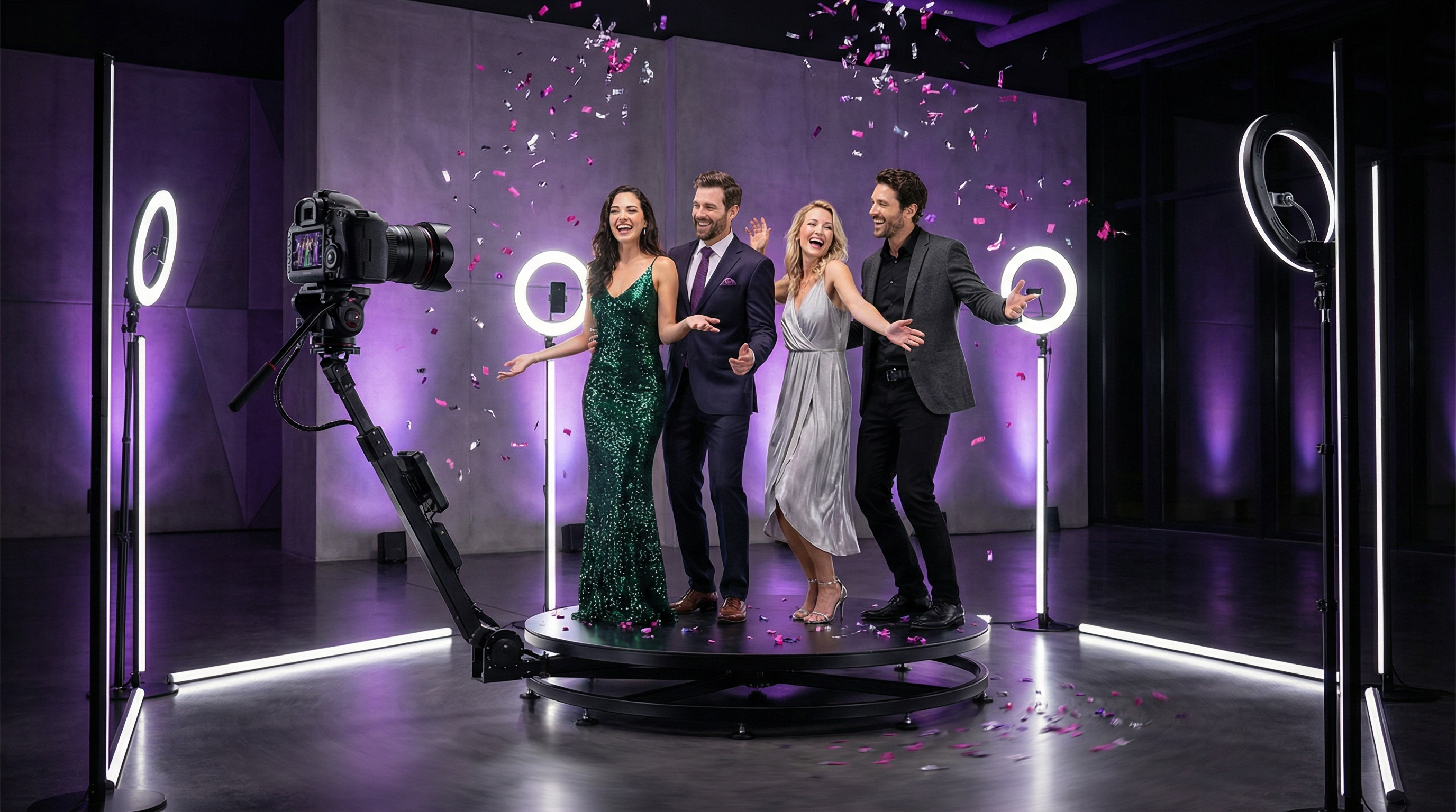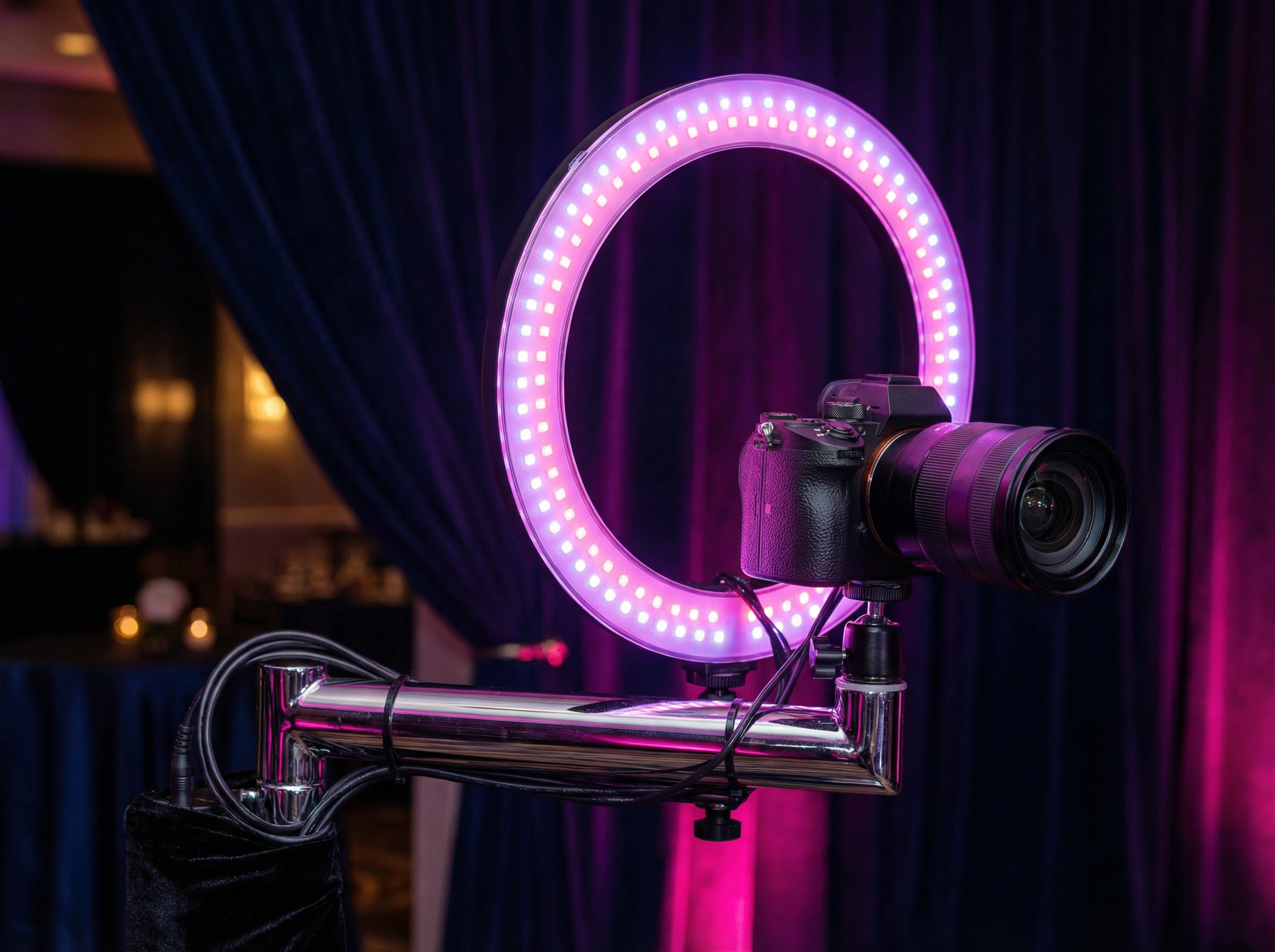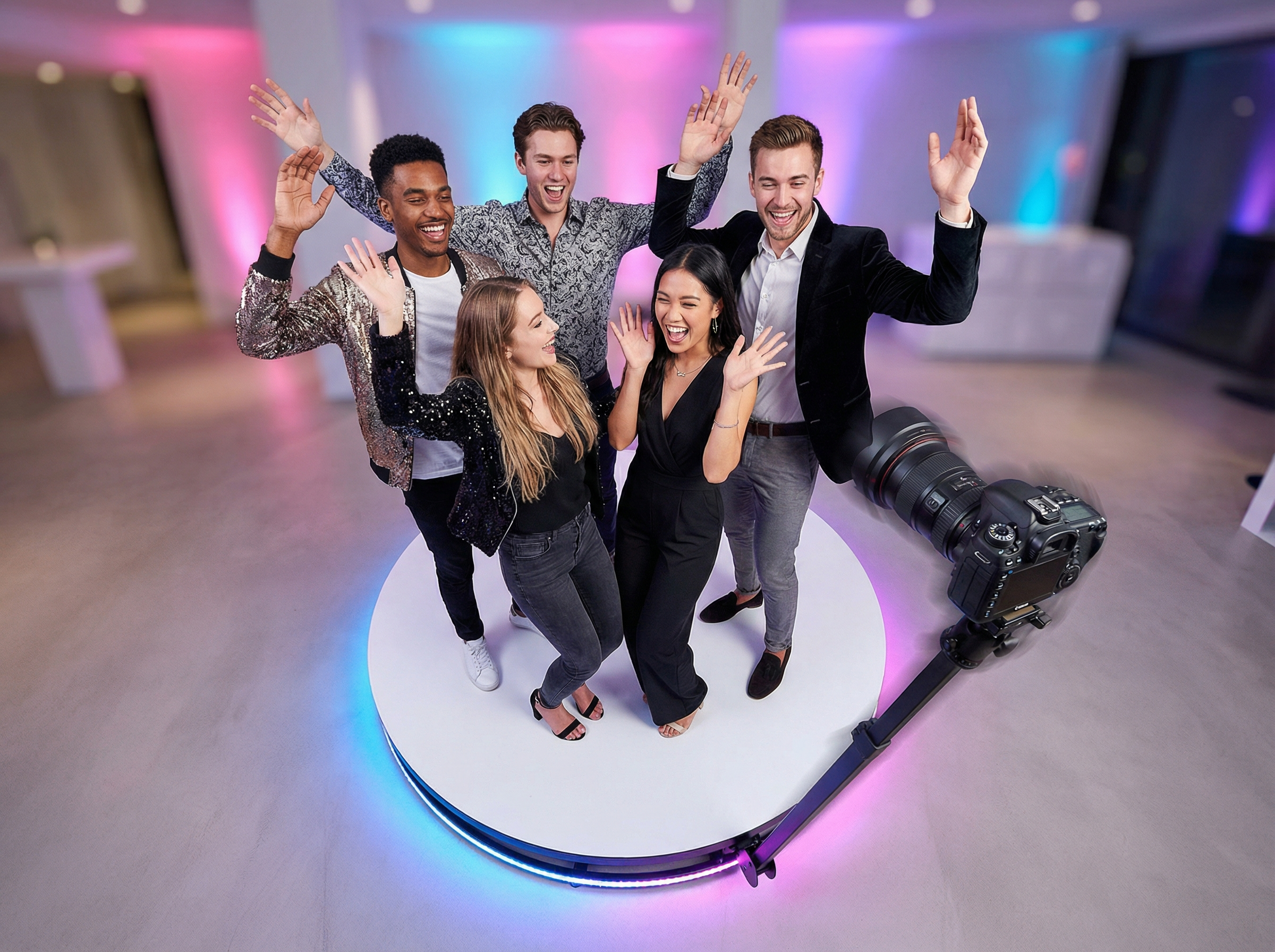 The sleek rotating arm, LED ring lights, and premium platform create a visually stunning centerpiece that will wow your guests and elevate your event.